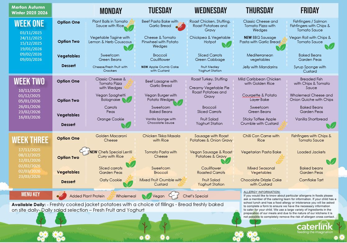 Caterlink provide the school meals for our pupils at lunchtime each day. The school lunchtime menu is located as a download lower down this page. More information about Caterlink can be found here.